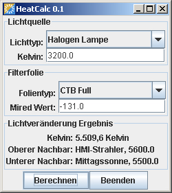 HeatCalc berechnet die Farbtemperatur einer beliebigen Lichtquelle, wenn sie durch eine Converter Folie verändert wird. Wer z.B. eine Innenraumszene hat, die er zusätzlich beleuchten muss, aber im Bild ein Fenster zu sehen ist, der bekommt entweder im Bereich des Fensters oder im Rest des Bildes einen Farbstich, da die Farbtemperaturen von Tageslicht und Kunstlicht nicht zusammenpassen.