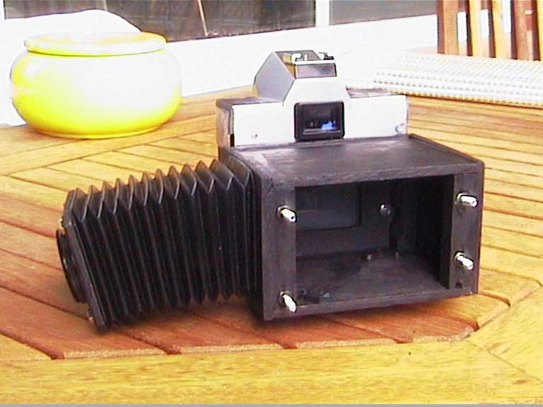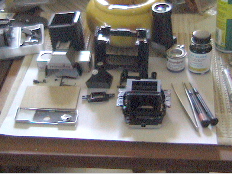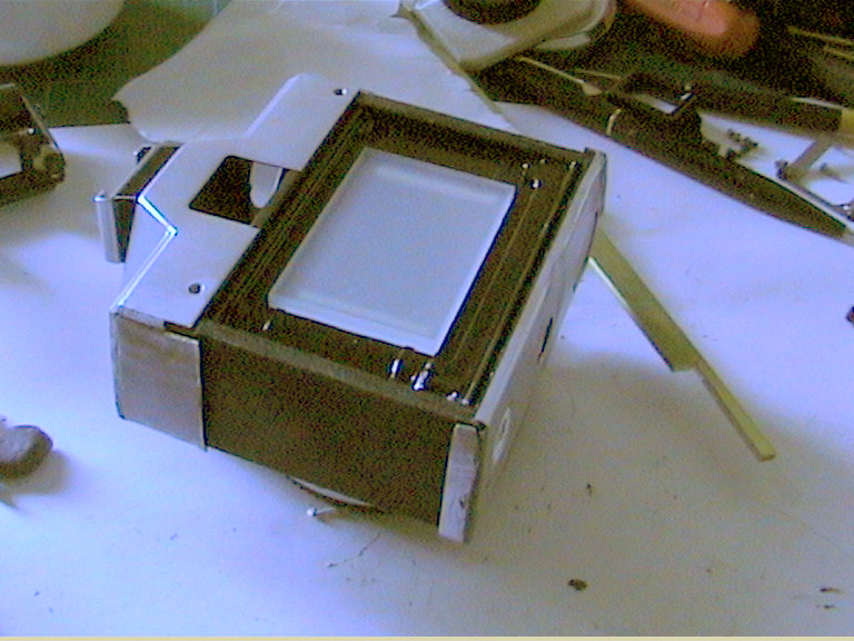 Basis für all meine 35mm-Adapter war eine alte Minolta SRT-101 Spiegelreflexkamera. Von dieser habe ich die Seitenteile abgeschnitten und den Bereich der Filmebene so modifiziert, dass ein sogenannter Glasscreen in Kleinbildfilm-Größe dort einpassbar war. Dieser Grundaufbau blieb bei mir immer gleich und wurde nur einmal in Frage gestellt, als die Möglichkeit bestand den Glasscreen durch eine Glasfaserplatte zu tauschen. Dazu kam es aber nicht mehr. So entstand z.B. zunächst auch ein Spiegelkasten hinter der Kamera. Wegen des o.g. Denkfehlers musste der aber wieder in eine einfache Rückplatte zurückgebaut werden.