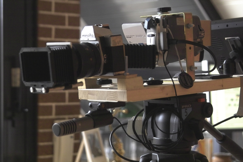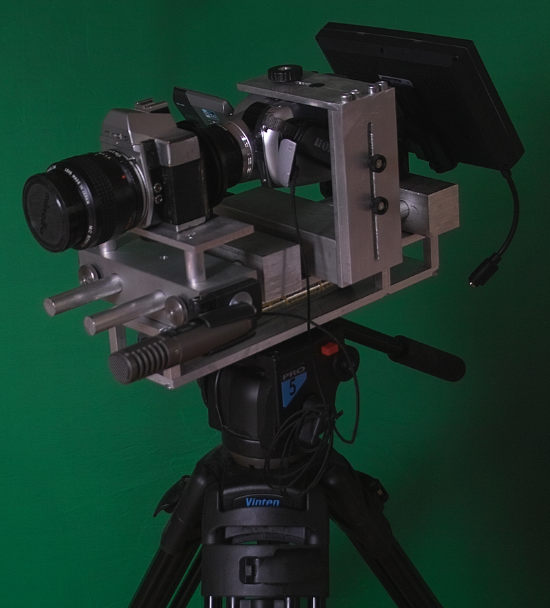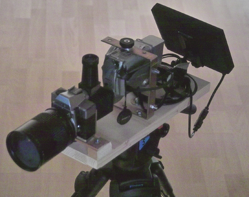 Auf dem Bild kann man sehen, dass die Videokamera kopfüber mit zwei Regalwinkeln auf einer Holzplatte befestigt wurde. So erspart man sich das Drehen der Bilder in der Nachbearbeitung. Hinter der Kamera wurde ein 7" TFT befestigt (Rückfahrmonitor) mit dem ein gedrehtes Bild zum Kamera-Operating betrachtet werden konnte. Der Adapter selbst wurde mit Holzklötzchen auf die richtige Höhe gebracht und vorne auf dem Brett angeschraubt. Darunter wurde noch ein externes Stereo Mikrofon für einen besseren Kamera Originalton befestigt. Das ganze konnte auf eine Schnellbefstigungsplatte für Stative montiert werden und war so tatsächlich einsatzbereit/verwendbar. Rechts daneben sieht man ein damit aufgenommenes, unbearbeitetes Einzelbild aus 'Mit Bande'.
